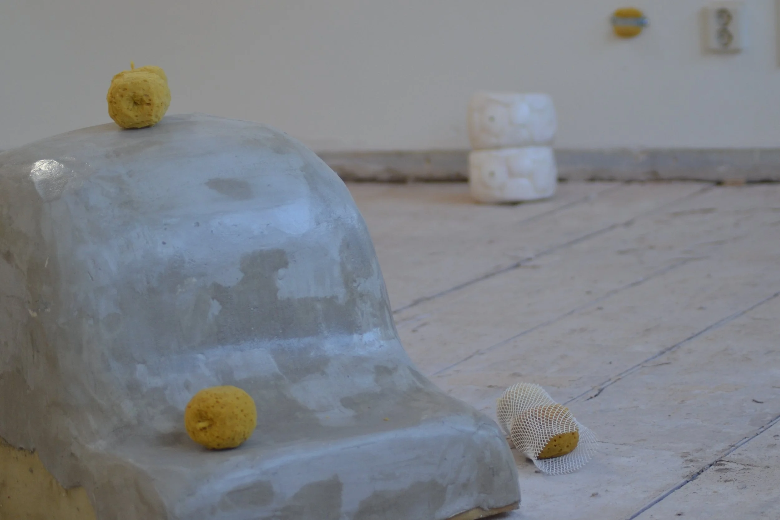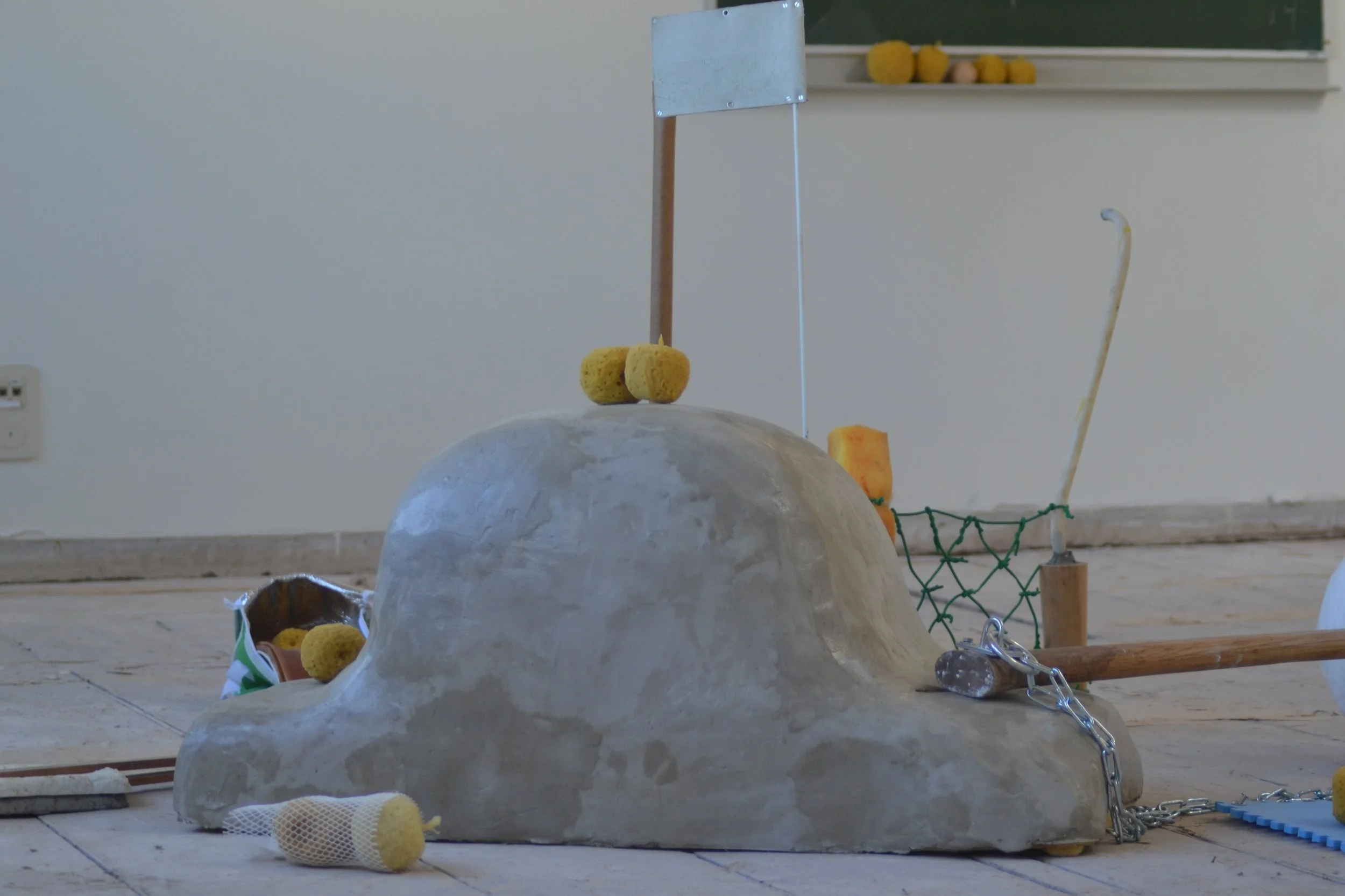 This sight specific installation deals with the question of reason after obbendoment. The installation is created at the Herenstraat 72 in Groningen which was a former shopping centre. The space in specific was most likely the staff rooms kitchen and toilet. There where traces left of young lust induced romances through vulgair symbols of the wall and the leftover what was ones a functional kitchen. I started working with the notion of bodily memory and the effect concrete has on our bodies. I created large rocks trying to give more space to the space. Along the way it resulted in interaction trying to find new meaning to the now new created space. Releaving it from a human made function resulting in an function /no function space.