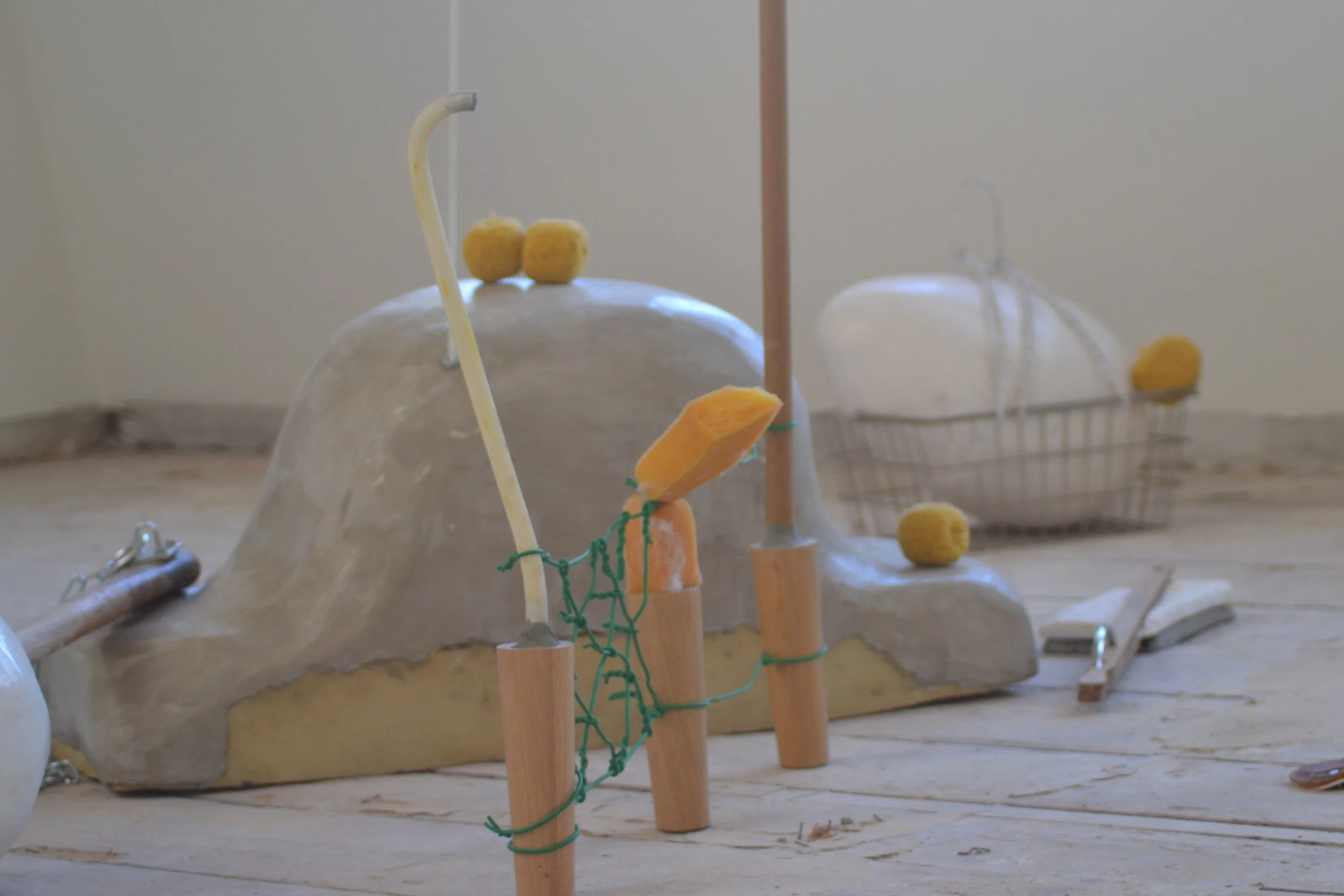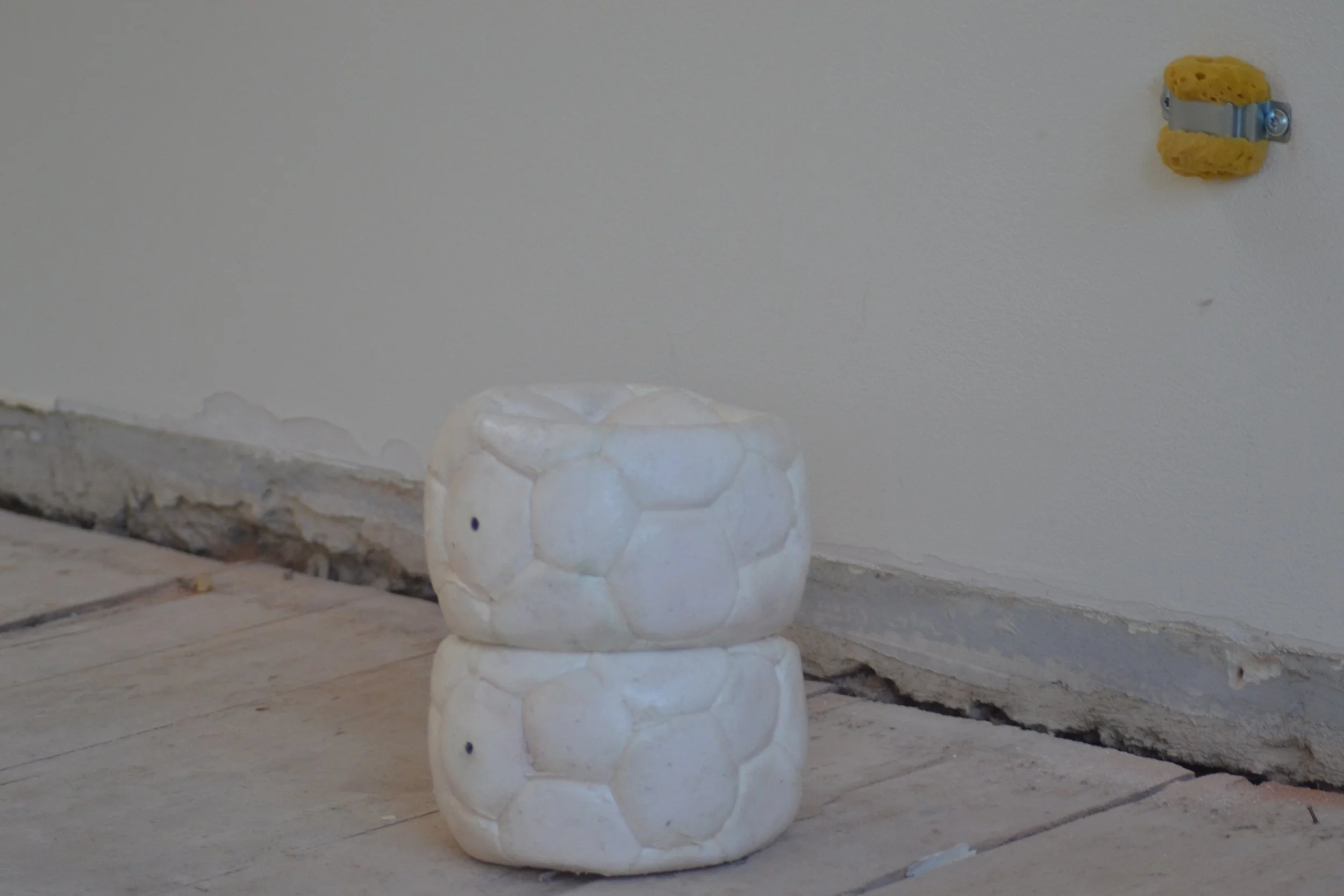 On the floor, sculptures resembling toys invite playful interaction. These sculptures are made from found objects and are called ‘Groeistuipen’, an old Dutch word describing the physical changes of puberty. The objects reflect the discomfort of relating and connecting, embodying a fragile state of being, and expressing a need for comfort and recognition.
